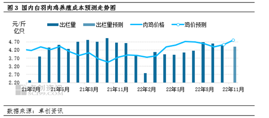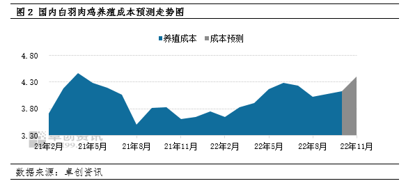 综合肉鸡养殖饲料及鸡苗价格走势,原料价格维持高位,叠加冬季取暖费用等有所提升,养殖难度偏大,卓创资讯预计11月肉鸡养殖成本为4.40元/斤,环比涨幅6.54%。受饲料价格高位影响,养殖成本明显高于去年同期,同比涨幅预计为21.88%。