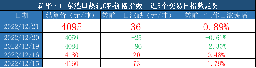 截至2022年12月21日,新华·山东港口热轧C料价格指数报4095元/吨,较前一交易日上涨36元/吨,涨幅0.89%。