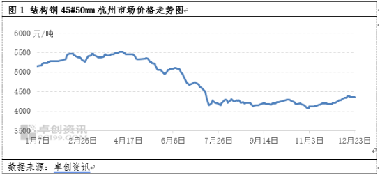 12月国内结构钢价格呈现涨后回落行情。卓创资讯监测数据显示,截至12月23日,杭州市场结构钢45#产品月中价格高点为4395元/吨,较12月初价格上涨了185元/吨,涨幅4.39%;下半月钢市交投减弱,价格有所下跌,最新价格为4350元/吨,较月中价格高点下跌了45元/吨,跌幅1.02%。