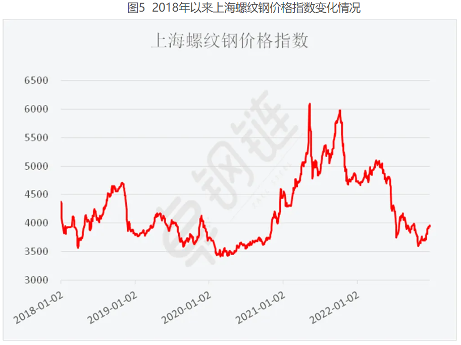 2022年钢材价格呈现整体下降态势。卓钢链数据显示,2022年初螺纹钢价格指数为4725元/吨,之后受内部受供给端下降、外部受俄乌冲突爆发影响,螺纹钢价格涨至超5000元/吨,此后随着时间推移,俄乌冲突对供应链冲击减弱,而美联储加息持续发酵,加上国内疫情多点频发,终端需求下降,钢材价格一路下行,11月时降至2022年最低点,较最高点价格下降超30%。临近年底,随着疫情防控政策优化,加上钢贸商进行冬储,钢材价格有所反弹,但整年来看,下降幅度仍超15%。