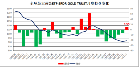 从黄金市场的持仓来看,2022年的最后一个月,黄金市场的投资需求似乎开始缓慢复苏。全球最大黄金ETF——SPDR GOLD TRUST持仓报告显示,虽然在2022年12月份,该ETF在连续了7个月的净流出之后,当月录得了9.55吨的净流入,显示出黄金投资需求复苏的初步迹象。