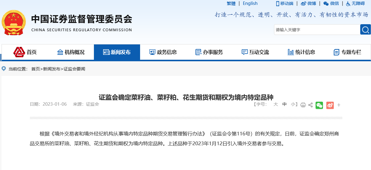 日前,证监会确定郑州商品交易所的菜籽油、菜籽粕、花生期货和期权为境内特定品种。上述品种于2023年1月12日引入境外交易者参与交易。