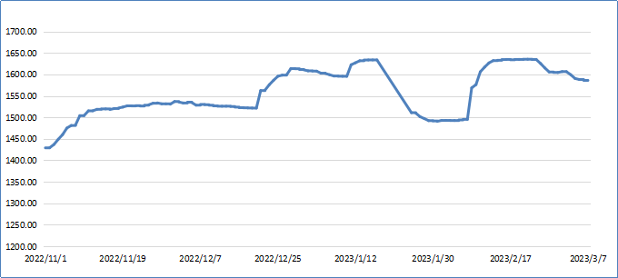 截至3月7日,新华-中国(运城)苹果价格指数报1586点,较2月28日下跌18.27点,跌幅1.14%。