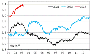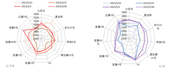 国内马铃薯种植需求持续提振,带动种薯市场交易量稳步提升。同期,定西种薯出货量及出货价格均稳步提升,尤其定西原种产地批发价格持续偏强运行。截至2023年3月10日,定西原原种产地批发均价为3960.18元/万粒,环比下跌0.96%;定西原种产地批发均价为2659.83元/吨,环比上涨1.21%。相比上产季,定西原种出货价格同比涨幅扩大,涨幅7.22%;定西原原种同比跌幅缩窄,跌幅0.86%。