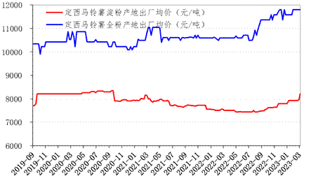 国内商品薯当季产量收缩且价格持续攀升,带动本产季全国初级薯制品出厂价格萦绕看涨预期。当前,下游食品企业采购不及预期,全国初级薯制品出厂价格持稳运行。期间,定西宽粉加工提振,定西马铃薯淀粉出厂价格再度出现波动上浮。截至2023年3月10日,定西马铃薯淀粉出厂价格报8208.70元/吨,环比上涨3.11%,同比上涨9.39%;定西马铃薯全粉出厂价格维持在11805.00元/吨,环比持平,同比上涨11.50%。