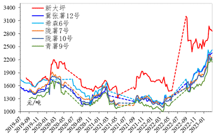 定西商品薯销售陆续见底,出货缓慢且出货价格整体震荡走弱,尤其兼用商品薯继续领跌。具体来看,当期新大坪产地批发价格为2857.14元/吨,环比持平;希森6号为2390.00元/吨,环比下跌1.49%;冀张薯12号则为2271.43元/吨,环比下跌3.62%,跌幅居首;而陇薯7号略微上涨至2258.89元/吨,涨幅0.68%;陇薯10号为2163.64元/吨,环比下跌1.82%;青薯9号为2092.14元/吨,环比下跌2.48%。当季国内商品薯整体供应紧张态势未发生改变,新采挖商品薯价格坚挺,窖藏薯尾货价格持续走弱,短期内全国商品薯销地批发价格将持稳运行。同期定西商品薯出货价格将继续走低。