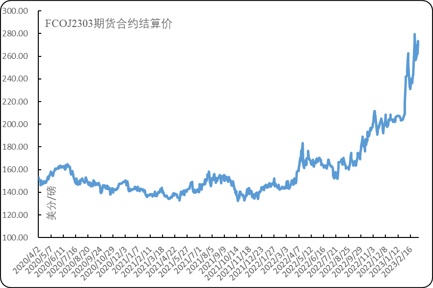 图1 全球冷冻浓缩橙汁(FCOJ2303)期货合约结算价走势图
