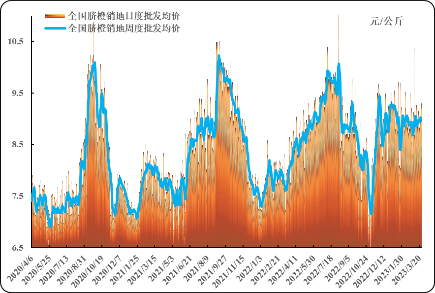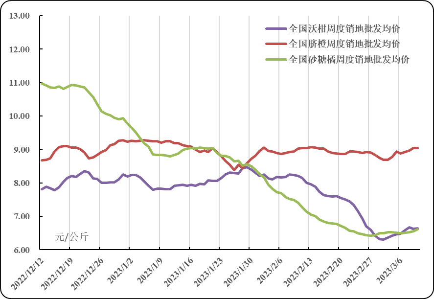 图5.2022/2023年度国内脐橙及其竞品销地批发周度均线走势图