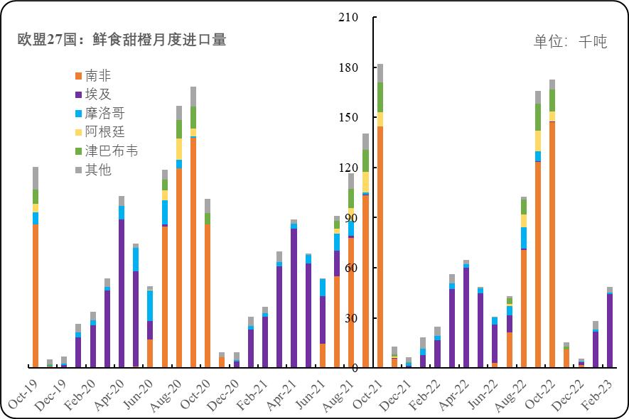 2月,欧盟本土中熟甜橙(脐橙)大量上市,第三国甜橙大规模进入欧盟市场。伴随2022年夏季高温干旱影响,地中海区域甜橙产量收窄,仅埃及甜橙回归正常水平,进而导致埃及甜橙在欧盟总体进口中占比大幅提升,还有摩洛哥、土耳其等进口比重大幅缩减。具体来看,2023年3月13日,欧盟委员会官方网站发布报告显示,2月欧盟进口甜橙4.86万吨,环比上涨71.79%,同比上涨96.24%。其中,进口埃及甜橙4.44万吨,同比上涨169.99%,进口份额同比上涨24.99个百分点;进口摩洛哥甜橙仅0.05万吨,同比下跌80.95%,进口份额同比下降10.32个百分点。