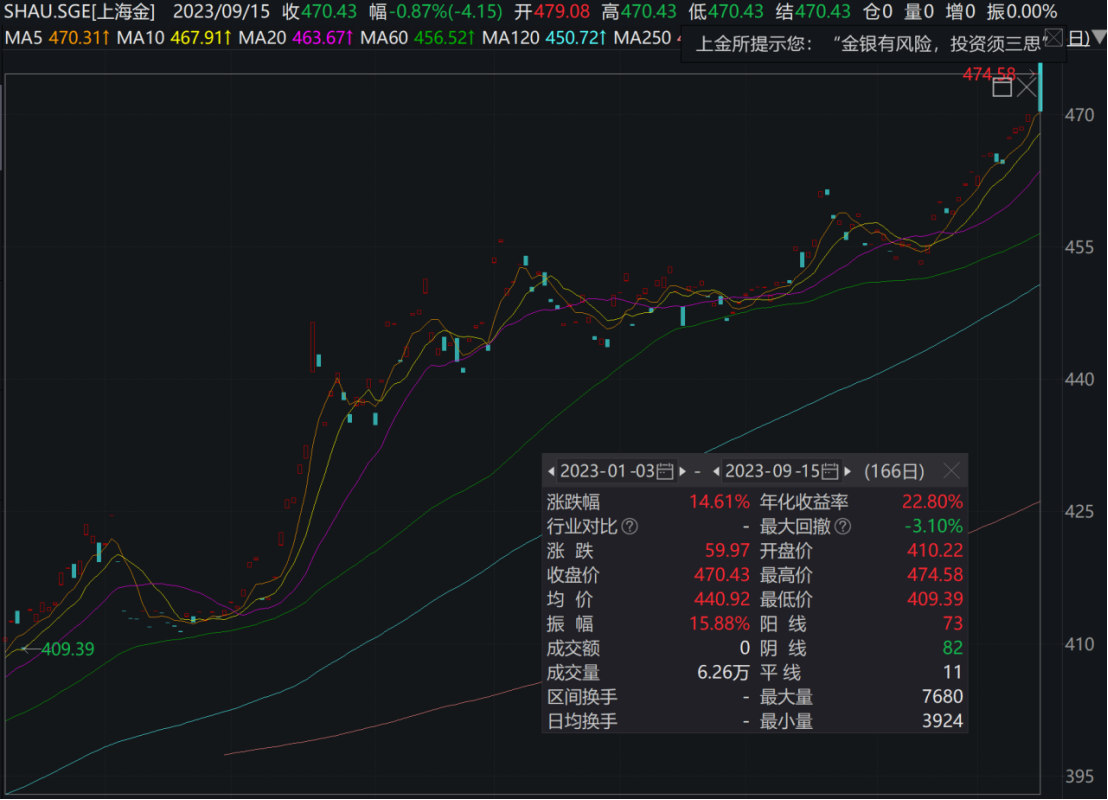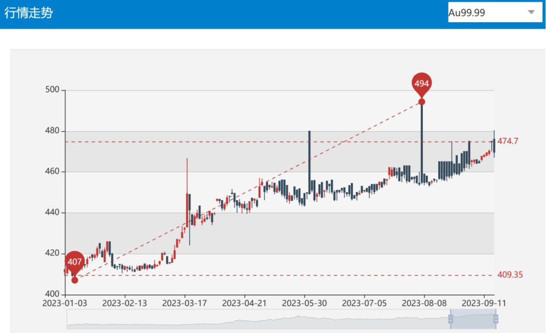 而国内金价却一路涨势如虹,截至9月15日上海金报收470.43人民币/克。另外,国内黄金首饰的价格也突破了600元/克。