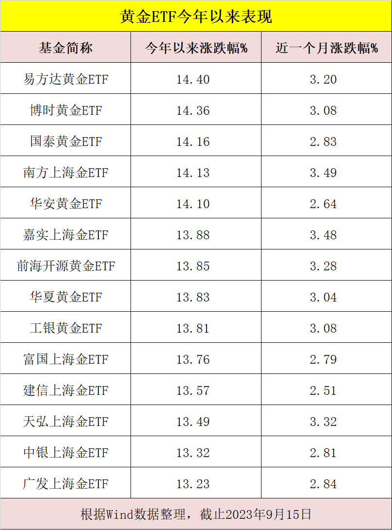 近一个月来,黄金类ETF涨幅较为明显。Wind数据显示,截至9月15日,近一个月,华安黄金ETF、国泰黄金ETF、易方达黄金ETF、博时黄金ETF等14只黄金类ETF涨幅超过2.75%;多只投资上海黄金交易所Au99.99的黄金ETF,今年以来收益率都达到13%、14%左右。
