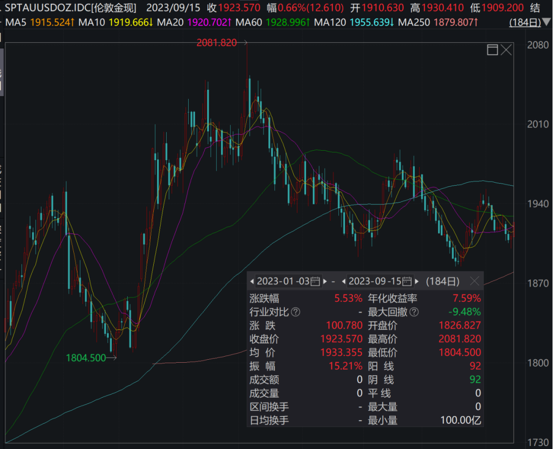 8月末以来,国际黄金现货价格出现回调,截至9月16日伦敦金现报收1923.57美元/盎司,较之前有所回暖。