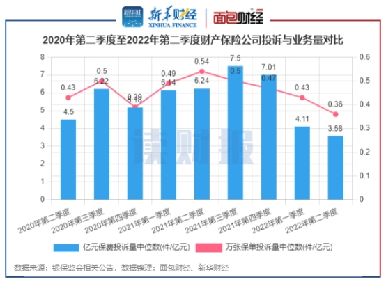 其中,2022年二季度财产保险公司亿元保费投诉量中位数为3.58件/亿元,较今年一季度微降0.53件。