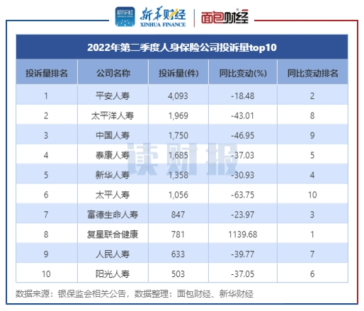 2022年第二季度,人身保险公司中平安人寿、太平洋人寿、中国人寿、泰康人寿和新华人寿的投诉量排名前五,5家公司的投诉量分别为4093件、1969件、1750件、1685件和1358件。值得注意的是,这五家人身险公司投诉量同比均有所下降。
