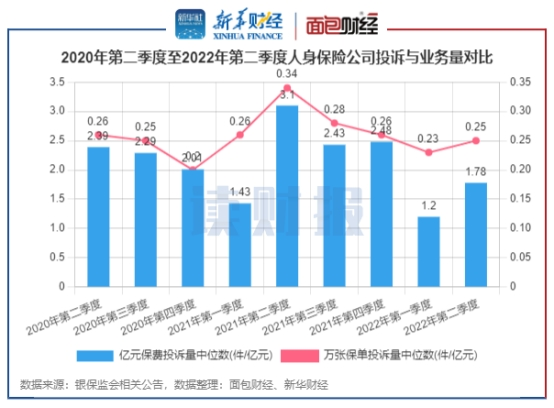 2022年二季度,人身保险公司亿元保费投诉量中位数出现上升。数据显示,2022年二季度,人身保险公司亿元保费投诉量中位数为1.78件/亿元,较今年一季度上升0.58件。