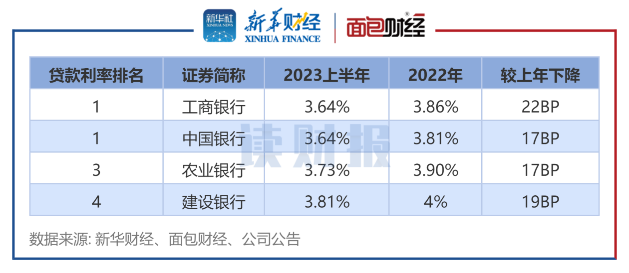 数据显示,四大国有银行上半年新发普惠型小微企业贷款利率均低于3.9%。其中,工商银行和中国银行的新发贷款平均利率均为3.64%,利率相对偏低。其次是农业银行,新发贷款平均利率为3.73%。建设银行的利率连续两个报告期相对偏高,2022年和2023上半年的利率分别为4%和3.81%。