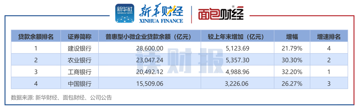 除此之外,中国银行和建设银行普惠型小微企业贷款余额的增幅均超20%,余额较上年末分别增加3226.06亿元和5123.69亿元。