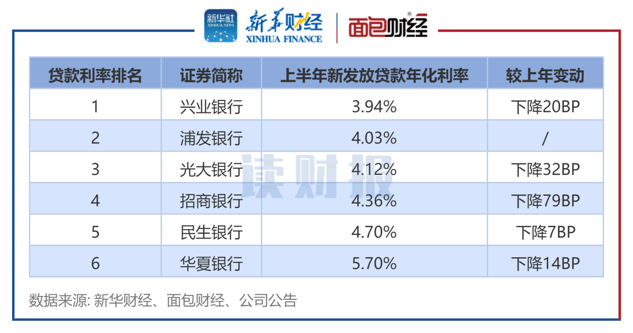 中报数据显示,9家A股的股份制上市银行中有6家披露了具体的新发贷款利率情况。其中,兴业银行上半年新发放的普惠型贷款利率最低,为3.94%;浦发、光大、招商和民生银行的贷款利率位列二至四位,利率期间在4%至4.7%之间。华夏银行的贷款利率相对偏高,为5.7%。