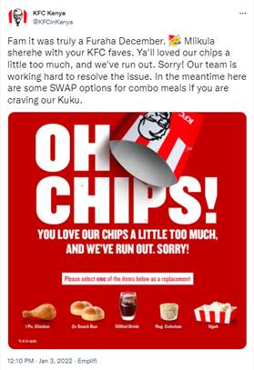 1月3日,肯德基肯尼亚门店发布公告说:“亲们有点太喜欢我们的薯条了,目前薯条已经无货。对不起!我们的团队正在努力解决问题。如果亲想点套餐,可以选择一些其他美味小食代替薯条。”