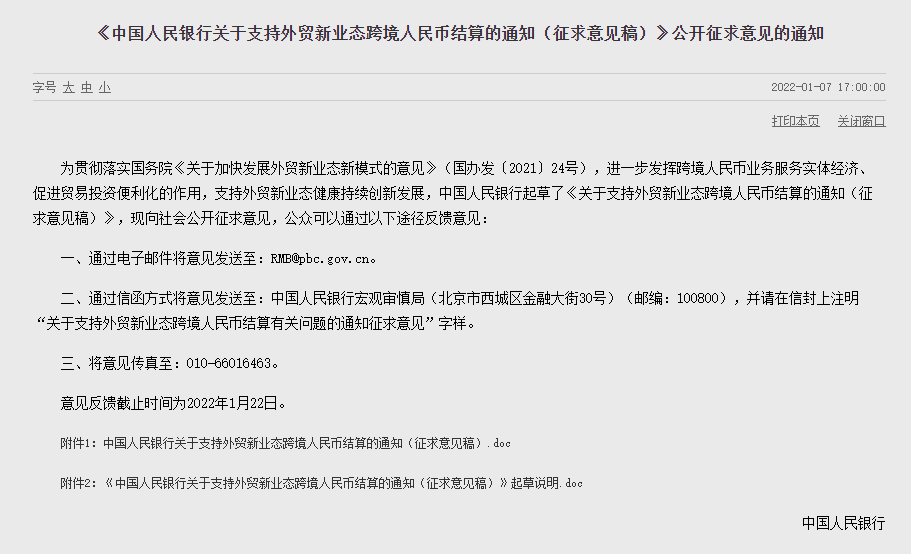 新华财经北京1月7日电 据人民银行官网7日消息,为贯彻落实国务院《关于加快发展外贸新业态新模式的意见》,进一步发挥跨境人民币业务服务实体经济、促进贸易投资便利化的作用,支持外贸新业态健康持续创新发展,中国人民银行起草了《关于支持外贸新业态跨境人民币结算的通知(征求意见稿)》(以下简称《通知》),现向社会公开征求意见。