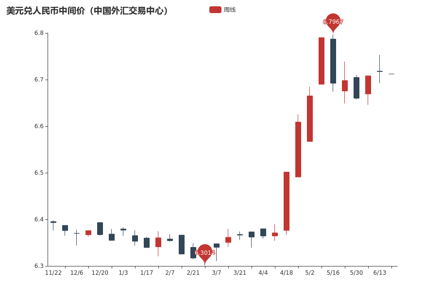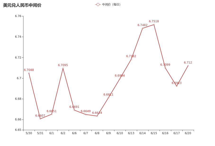 6月20日,人民币中间价下调197个基点。美元兑人民币中间价报6.7120元,上一交易日中间价报6.6923元,官方收盘价报6.7010元,夜盘收盘价报6.7173元。
