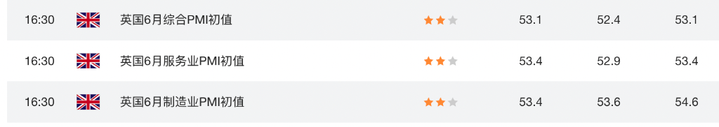 数据显示,英国6月综合PMI初值为53.1,预期值为52.4,前值为53.1;6月制造业PMI初值为53.4,低于预期值53.6和前值54.6,为2020年7月来新低。服务业PMI初值与上月持平。