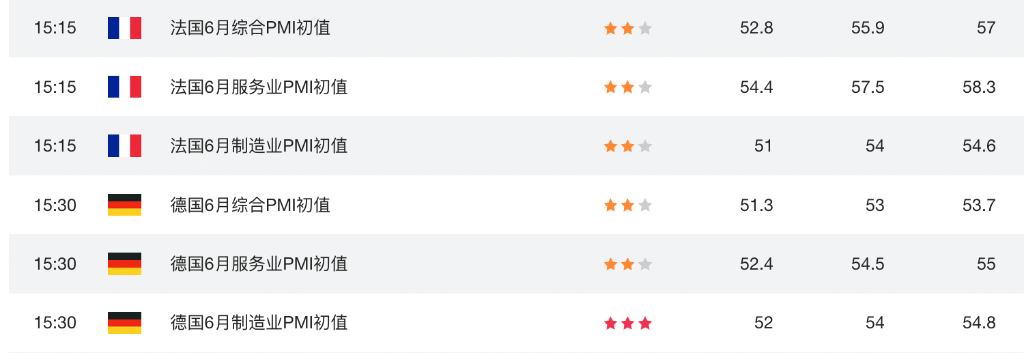 数据显示,6月德国综合PMI初值下降2.4至51.3,低于市场预期值53,也低于前值53.7;法国6月份综合PMI初值下降4.2至52.8,远低于市场普遍预期的55.9,也大幅低于前值57。