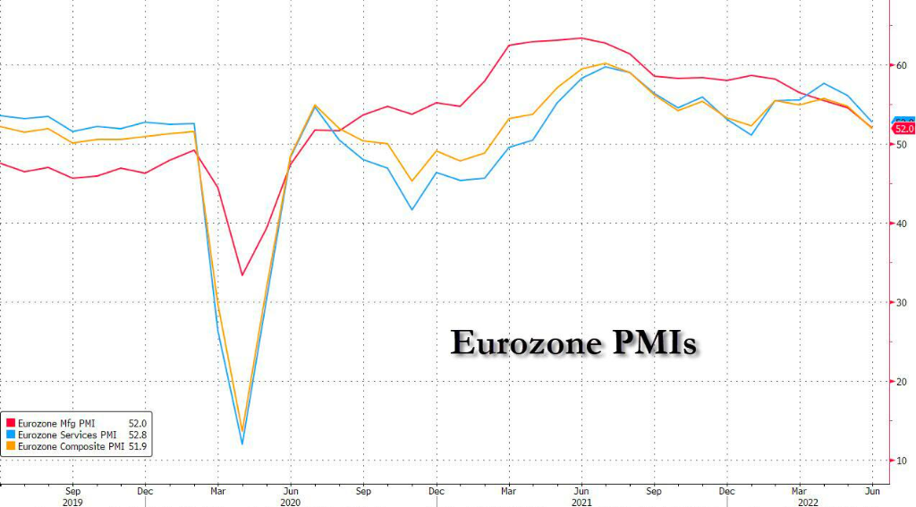 创纪录的高通胀、需求疲软和企业信心水平的下降正加大欧元区经济衰退的风险。数据显示,6月份欧元区综合PMI初值降至51.9,为16个月来的低点,远低于市场普遍预期的54和5月份的54.8。