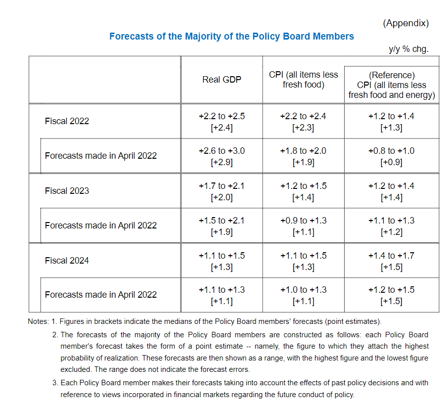 在最新的季度预测中,日本央行将截至明年3月的2023财年核心通胀预期由4月份预测的1.9%上调至2.3%。日本央行还将本财年经济增长预期从此前预测的2.9%下调至2.4%。