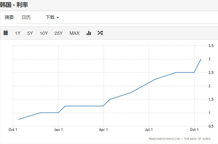 数据显示,这是韩国基准利率自2012年10月以后的十年来首次突破3%。包括去年8月、11月和今年1月、4月、5月、7月、8月和10月,在短短一年零两个月的时间里,韩国基准利率已上调八次,其中六次升幅为25个基点,两次为50个基点,累计加息250个基点。