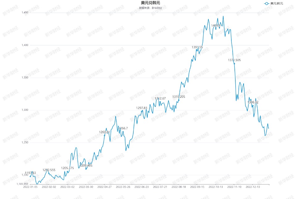 受到国际收支急剧恶化的影响,韩元在2022年大部分时间内表现欠佳。韩元自2021年1月的1079水平开始下行,并于2022年10月创下2009年3月16日以来的新低至1445.80。当时,市场普遍预计韩元兑美元年底前可能进一步贬值至1500。