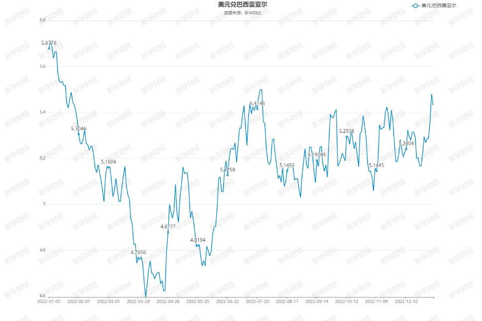 2022年能够强势美元的压力实现升值,还有巴西雷亚尔。巴西央行为遏制通胀从2021年3月17日起就开启了货币紧缩政策,经过连续12次加息后,于2022年8月3日将该国基准利率提高至13.75%,其间累计加息11.75个百分点,成为1999年以来累计幅度最大的加息周期。如此激进的加息也得到了明显成效,巴西成为首个通胀见顶的发展中国家,巴西雷亚尔兑美元也实现了超过5% 的涨幅。