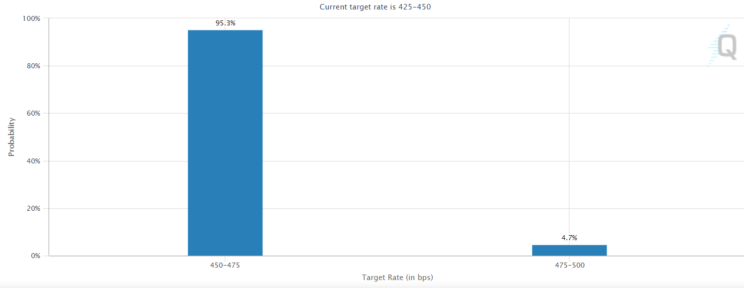 通胀方面,周三发布的另一份报告显示,12月商业和批发通胀放缓幅度超过预期,增强了价格压力在经济中降温的希望。此外,与“恐怖数据”同一时间公布的12月PPI数据环比下滑0.5%。机构表示,PPI通胀下降是美联储所希望的,但在零售销售数据中看到的经济疲软不会被视为好消息。不过,这两个数据都预示着美联储不会那么鹰派。根据CME的“美联储观察”工具,目前市场基本笃定,美联储将于下次议息会议上加息25个基点。