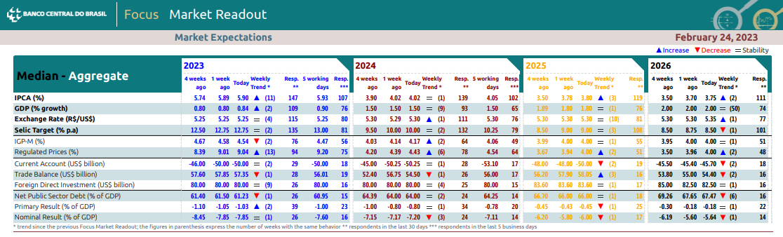 此外,市场将2023年末美元兑雷亚尔汇率估值保持在5.25不变;对2023年贸易顺差估值从578.5亿美元下调至573.5亿美元;对2023年外国直接投资估值保持在800亿美元不变。