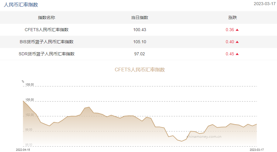 2023年3月17日CFETS人民币汇率指数为100.43,按周涨0.36%;BIS货币篮子人民币汇率指数报105.10,按周涨0.40%;SDR货币篮子人民币汇率指数报97.02,按周涨0.45%。