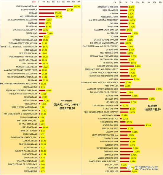 从盈利能力来看,美国银行业普遍处于较优水平,4715家银行的ROA平均水平为1.55%,5000亿美元以上银行的ROA水平均超过1.10%。要知道,2022年国内银行业的ROA平均水平只有0.76%,其中大行为0.88%、股份行为0.79%、城商行为0.54%、民营银行为1.03%、农商行为0.53%、外资行为0.59%。