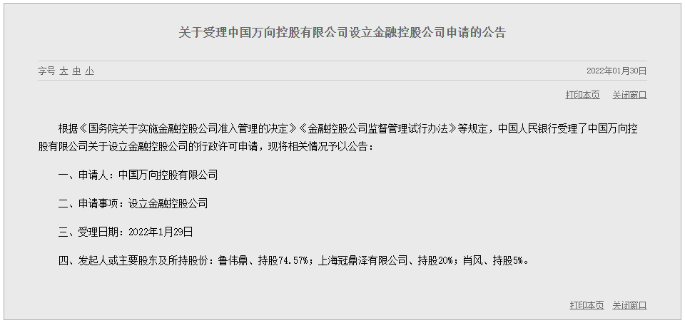 据人民银行30日消息,央行29日受理了中国万向控股有限公司关于设立金融控股公司的行政许可申请;其发起人或主要股东及所持股份为:鲁伟鼎、持股74.57%,上海冠鼎泽有限公司、持股20%,肖风、持股5%。