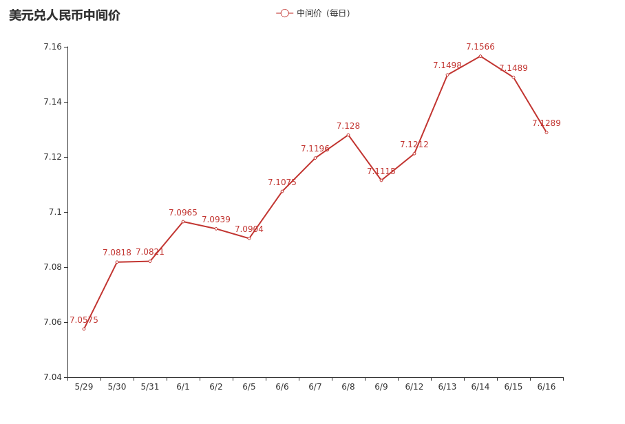 6月16日,人民币中间价上调200个基点。美元兑人民币中间价报7.1289元,上一交易日中间价报7.1489元,官方收盘价报7.1555元,夜盘收盘价报7.1225元。