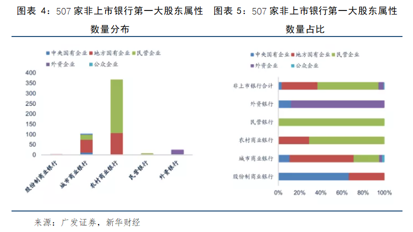 从股东性质角度来看,城商行以地方财政或国有企业为主,农村中小银行以私营企业为主。