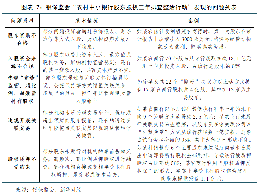 2018年至2020年,为深入贯彻落实党中央、国务院关于完善金融机构法人治理的决策部署,银保监会系统组织开展了“农村中小银行股东股权三年排查整治行动”。三年时间内,3898家农村中小银行全部完成了机构自查和监管检查。三年排查整治共涉及持股1%以上股东38.5万个、股权3889亿股,累计发现问题1.99万个。银保监会在此轮排查发现的问题主要有五个方面:股东资质不合格;入股资金来源不合规;逃避“穿透”监管,超比例、超数量持有股权;违规开展关联交易;股权质押不受约束等。