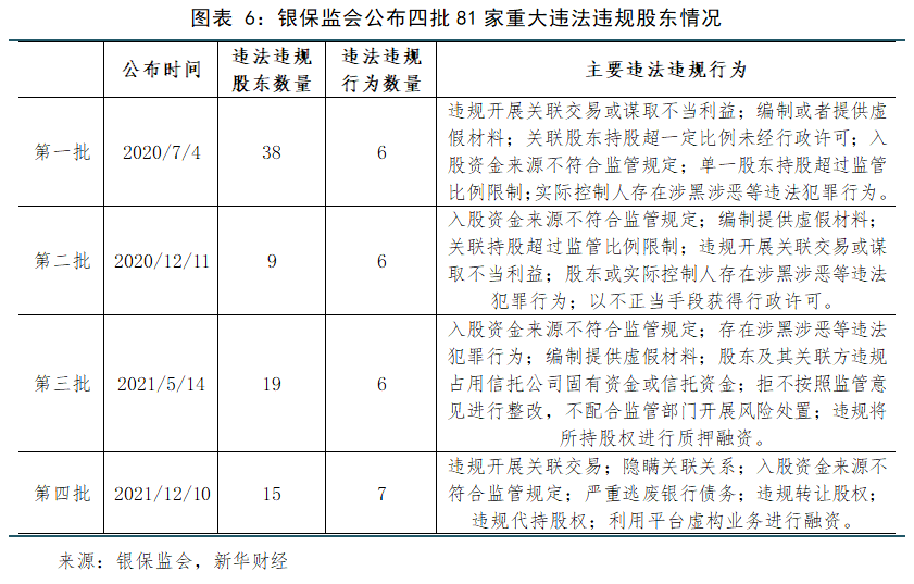 2021年12月10日,银保监会披露15家重大违法违规股东名单,这是银保监会自2020年7月以来第四次披露重大违法违规股东名单。截至目前,银保监会已累计披露了81家重大违法违规股东名单,涉及7家城商行、9家农村金融机构、3家保险、2家金融租赁、2家信托、1家汽车金融以及1家财务公司。银保监会披露的81家股东涉及的违法违规行为主要有17类。