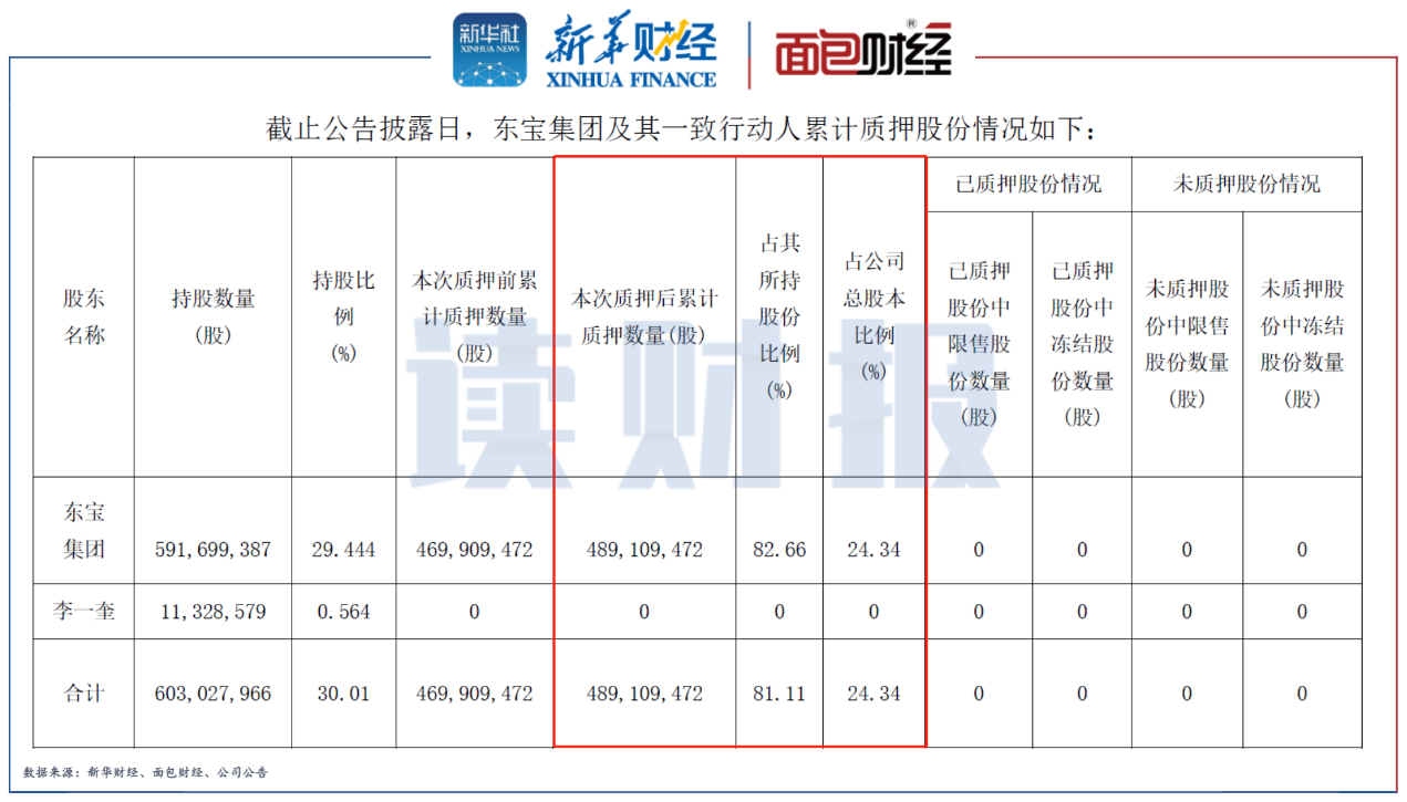 2022年3月的质押公告显示,通化东宝的控股股东东宝集团及其一致行动人合计持有公司股份约6.03亿股,占公司股份总额的30.01%。东宝集团及其一致行动人累计质押4.89亿股,占其所持公司股份总额的81.11%,占公司股份总额的24.34%。