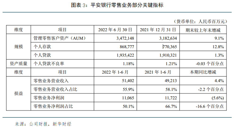 2022年上半年,平安银行零售业务实现营业收入514.02亿元,同比增长4.4%,在全行营业收入中占比为55.9%;零售业务净利润110.65亿元,同比下降5.6%,在全行净利润中占比为50.1%。零售业务净利润下降,主要是年初以来受国内疫情及宏观经济环境影响,居民就业、收入和消费及零售业务发展受到一定冲击,导致平安银行零售业务营业收入增速放缓,资产质量承压。据此,该行加大了零售资产核销及拨备计提力度,导致利润同比下降。但凭借近年积累的数字化经营能力,平安银行零售业务总体经营保持稳健,同时在降本增效、提升资源配置的精细化水平方面取得成效,零售成本收入比同比下降1.54个百分点。