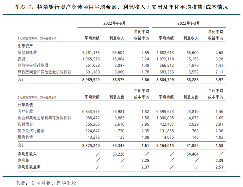 财报数据显示,二季度,招商银行贷款和垫款年化平均收益率4.55%,环比下降了13个基点,存款年化平均成本率1.52%,环比上升了6个基点。