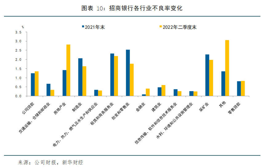 不良生成压力增加。招商银行还公布了公司口径的不良生成情况。上半年,公司口径新生成不良贷款307.02亿元,同比增加74.60亿元;不良贷款生成率(年化)1.13%,同比上升0.18个百分点。从业务大类看,公司贷款不良生成额90.73亿元,同比增加25.12亿元;零售贷款(不含信用卡)不良生成额35.81亿元,同比增加10.50亿元;信用卡新生成不良贷款180.48亿元,同比增加38.98亿元。从行业看,不良生成主要集中在房地产业;从客群看,不良生成多数为大型企业