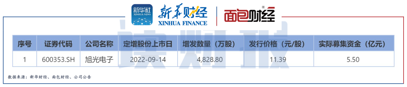 上周实施定增的上市公司是旭光电子,该公司此次共发行约4828.8万股,发行价格为11.39元/股,实际募集资金总额约5.5亿元。