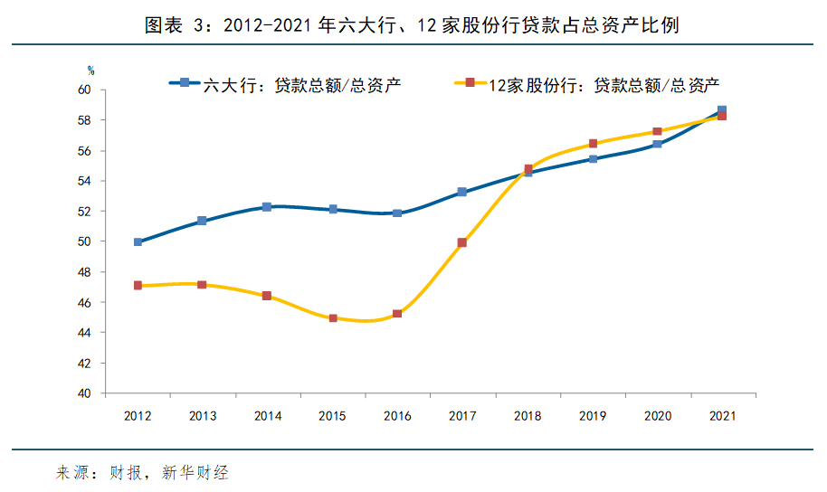 从六大行和股份行的数据来看,从2012年到2016年,六大行贷款总额占总资产的比重从49.98%提升至51.89%,上升了1.91个百分点,12家股份行贷款总额和占总资产的比重则从47.08%下降至45.28%。而从2017年开始,银行业走上回归信贷主业之路后,贷款总额占总资产的比重开始迅速上升,到2021年,六大行贷款总额占总资产比重上升至58.61%,较2016年上升了6.72个百分点,12家股份行贷款总额占总资产的比重则上升至58.24%,扭转了此前的下降趋势,较2016年上升了12.96个百分点。
