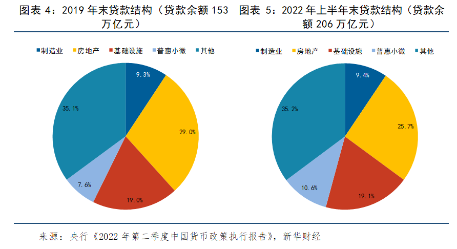 基建投资和房地产等资金密集型领域信贷需求趋势性转弱。基建投资结构向城市更新、社会事业等民生领域倾斜,传统“铁公基”贷款需求转弱,贷款比重由2010年的25%降至2019年以来的19%左右,房地产贷款比重也由2019年峰值的29%回落至2022年6月末的25.7%。