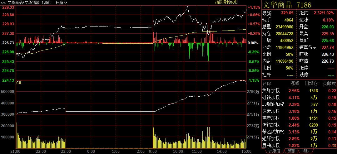 截至8日下午收盘,追踪国内商品市场的综合指数收报229.05点,较上一交易日上涨2.32点,涨幅1.02%。全天商品市场累计净流入资金103.61亿元,较前两个交易日显著增加。