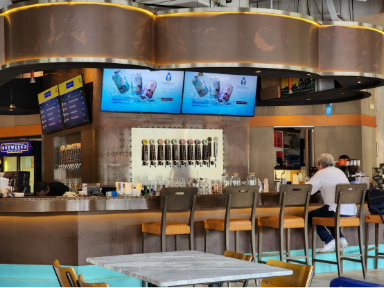 7月6日,BREWERKZ餐馆内的电视正在播放新生啤广告。